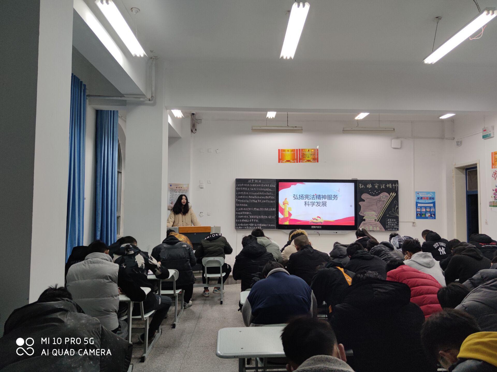 各班团支书通过演讲、PPT放映、播放视频、提问讨论等方式,引导同学们积极参与学习讨论。各班首先学习了宪法法律知识简介,了解宪法是国家的根本法;是治国安邦的总章程,是保证国家统一、民族团结、经济发展、社会进步、长治久安的法律基础;是党执政兴国带领全国各族人民建设社会主义强国的法制保证。各班主要学习了宪法第二章公民的权利与义务的相关内容,并结合案例进行了讨论发言。