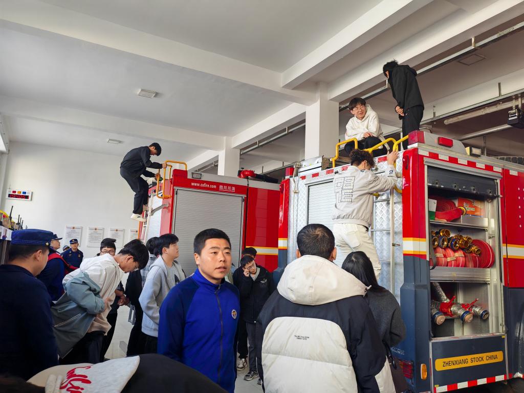 2024级的同学们首先参观了消防站的整体布局和各个功能区域,了解了消防队员们的日常生活和训练情况。随后,在专业消防员的引导下,员工们近距离观察了各种消防车辆和器材,包括消防水枪、水带、灭火器、破拆工具等,消防员详细讲解了这些设备在不同火灾场景中的应用和操作方法。