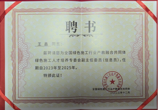 通过本次会议,太阳成集团tyc151cc王鑫老师受聘为“全国绿色施工行业产教融合共同体绿色施工人才培养专委会副主任委员”,他表示,作为本次受聘的副主任委员,太阳成集团tyc151cc将持续关注和掌握绿色施工行业发展方向,了解社会需求,研究当前“教育-科技一人才”统筹推进中的问题和不足,明确共同体的发展目标和工作重点。并与其它两个专委会加强的联系,做好共同体建设与发展的顶层设计;联合其它两个专委会在人才培养体系更新、特色课程建设、技术前沿探索、产教融合新模式尝试等方面发挥牵引和领导作用。