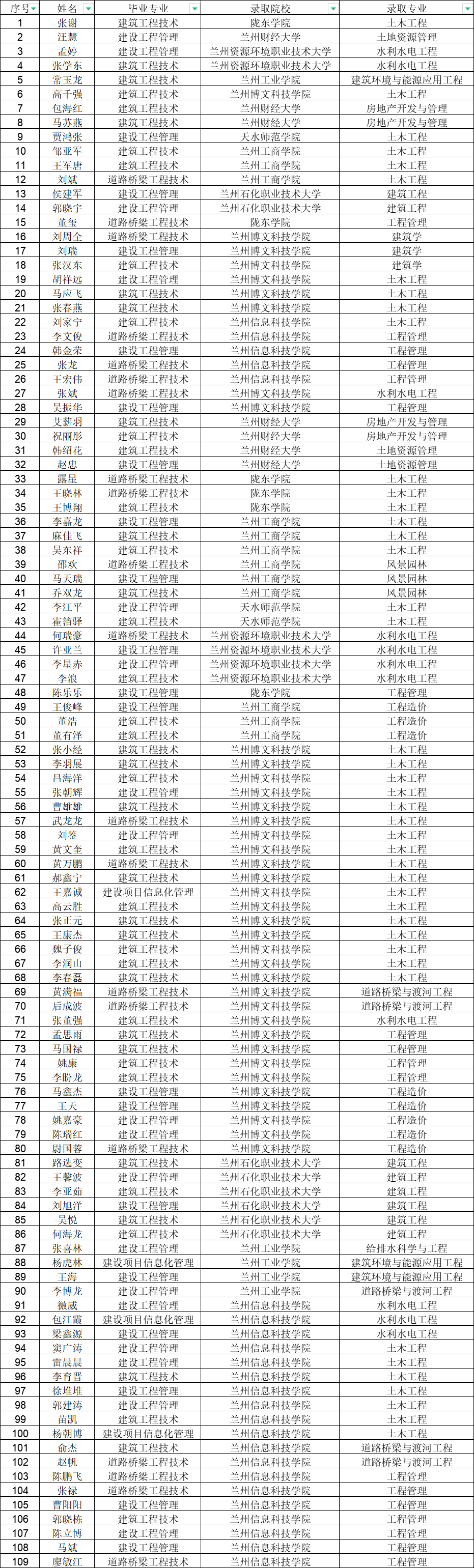 太阳成集团tyc151cc共122人参加统一招生考试,其中109人被兰州工业公司、天水师范公司、兰州财经大学、陇东公司、等9所公司录取,录取率为90.1%。